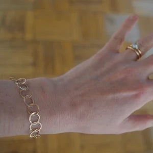 This bracelet is really beautiful. The organic hand-hammered texture brings the links to life. Since everything is made by hand, Nava was very willing to customize clasp, gold color, and finish to make it perfect for me. And it really is. It goes with everything... Thank you for making it! Wonderful communication and care about the shipping, as well.